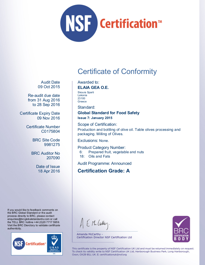 Product Certification (BRC ENTENDED) of Spartan Treasure website / Kalamon Olives