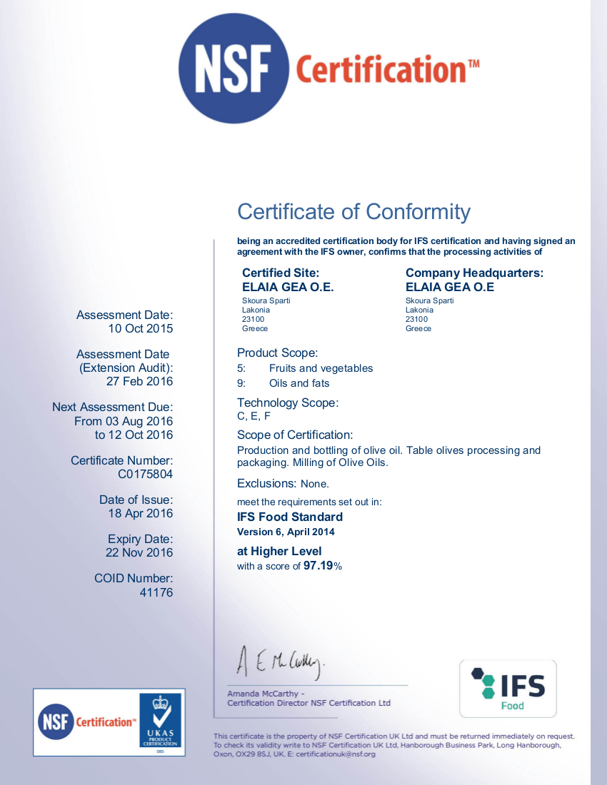 Product Certification (IFS EXTENDED) of Spartan Treasure website / Kalamon Olives