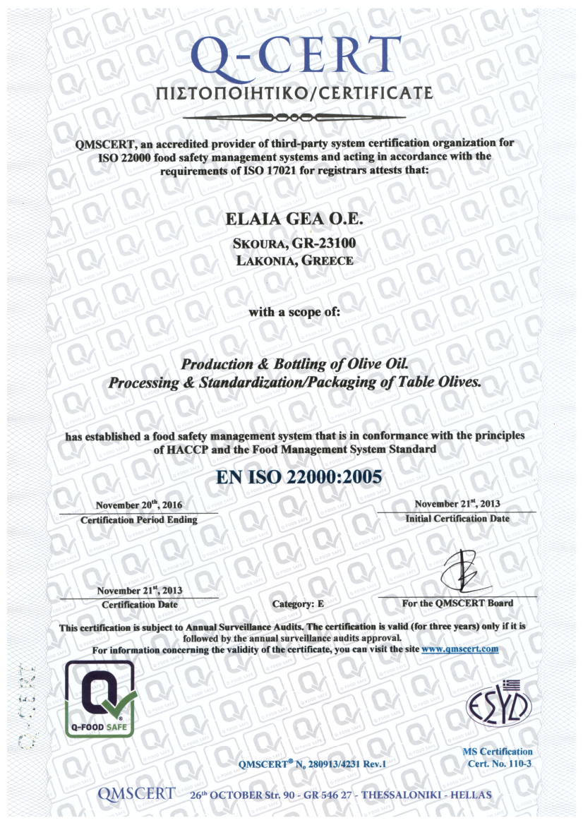 Product Certification (ISO 22000 ENG) of Spartan Treasure website / Kalamon Olives